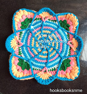 skip next St, ch1, fpdc around last fpdc, YO6 treble around fpdc, skip next St,